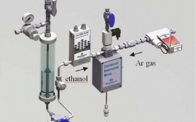 Bronkhorst受控蒸发混合系统(CEM)用于产生受控的乙醇蒸汽流,其进入等离子体,在大气压下将其转化为石墨烯粉末。以氩气作为乙醇蒸汽流的载气。作为该蒸汽流量控制系统的一部分,热质量流量控制器(MFC-EL-FLOW Select系列)控制氩气流量,液体质量流量控制器(MFC-mini CORI-FLOW系列)控制乙醇流量。这些装置与温控混合/蒸发仪器CEM连接,产生蒸汽/气体混合物。