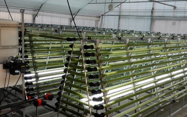 在Radius,微藻养殖的实验室试验在密闭的管状光生物反应器中进行,每个光生物反应器的总容积为300升,在受控温室的大气压下操作。使用两个IN-FLOW热式质量流量控制器,每个控制器向实验室装置的反应器供应二氧化碳,每个反应器的最大剂量流量为886 ml/min 二氧化碳。在当前的pH值和提供的CO2流量之间有直接的、自动的反馈。
