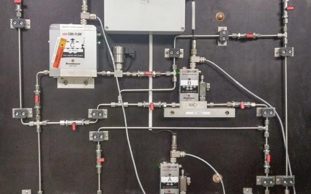 Bronkhorst解决方案由安装在流量板上的三个不同的mini CORI-FLOW质量流量控制器和一些附加的控制和监测设备组成。为了研究小流量的影响,需通过少量的设备使用许多不同的纯水流量作为输入参数。mini CORI-FLOW M12 流量控制器的供水量为2-100g/h, mini CORI-FLOW M13 流量控制器的供水量为20-1000 g/h,而mini CORI-FLOW M15 的供水量为0.8 – 40 kg/h。通过所用流量板,三种装置都可以选用合适的流速。